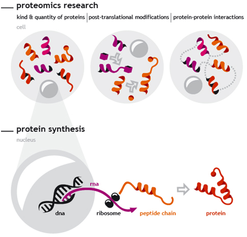 Toen zo’n tien jaar geleden het complete genoom van de mens in kaart was gebracht, waren de verwachtingen hooggespannen. Nu zou dus duidelijk worden hoe de levensprocessen worden aangestuurd. Al spoedig verdampte dit optimisme echter weer. Veel belangrijker dan kennis van het handjevol genen (22.000 bij de mens) bleek inzicht in het proteoom, de ruim honderdduizend eiwitten (proteins in het Engels) die in onze lichaamscellen het feitelijke werk doen. Na genomics was het de beurt aan proteomics.