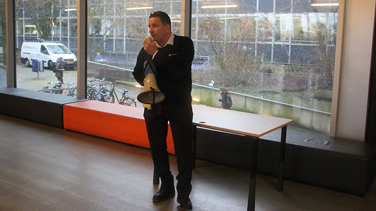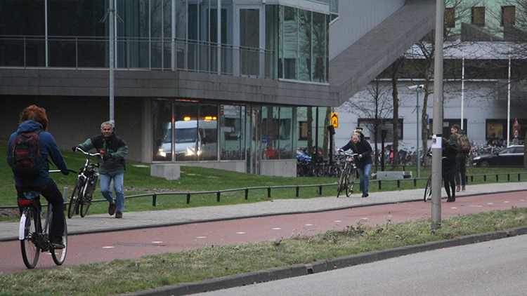 In de verschillende gebouwen van de UU wordt omgeroepen voorlopig niet de straat op te gaan vanwege de storm. "Er waait vanalles over straat en dat kan gevaarlijk zijn", zegt de man van security. Niet alle studenten volgen zijn advies op.