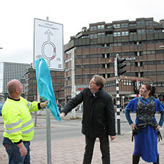 Wethouder Lintmeijer (Verkeer, GroenLinks) gaf vrijdag het startschot voor de campagne om fietsers via de Herenroute te laten rijden. Rode en witte stippen op het fietspad, kleine rode bordjes en andere informatieborden geven het traject aan. Ook zet de gemeente verklede acteurs in om de alternatieve weg te wijzen.