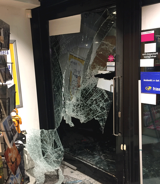 De schade aan de glazen pui van de winkel was aan het eind van de ochtend alweer grotendeels hersteld. Een foto (zie onder) laat zien hoe de politie de boel eerder aantrof: een deur compleet aan diggelen.