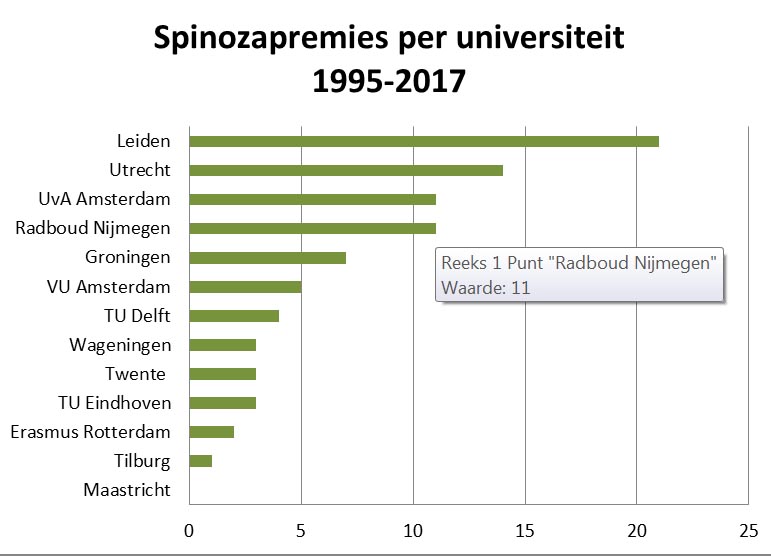 Sinds de start in 1995 heeft de Universiteit Leiden de prijs al 21 keer ontvangen, meer dan alle andere universiteiten. Utrecht is de nummer twee met veertien van de 85 Spinozapremies. Eveline Crone is de zestiende vrouw die de premie krijgt.