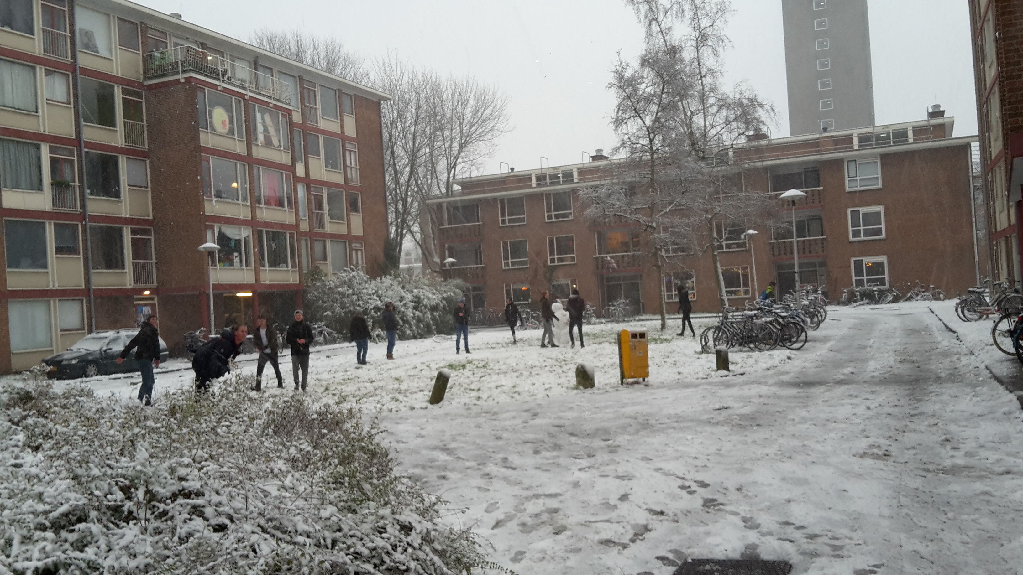 16.20 Bij het IBB vindt een sneeuwballen gevecht plaats. Er staan verschillende sneeuwmannen en studenten werpen ballen tegen de ramen van de eenheden om te kijken wie er thuis is.