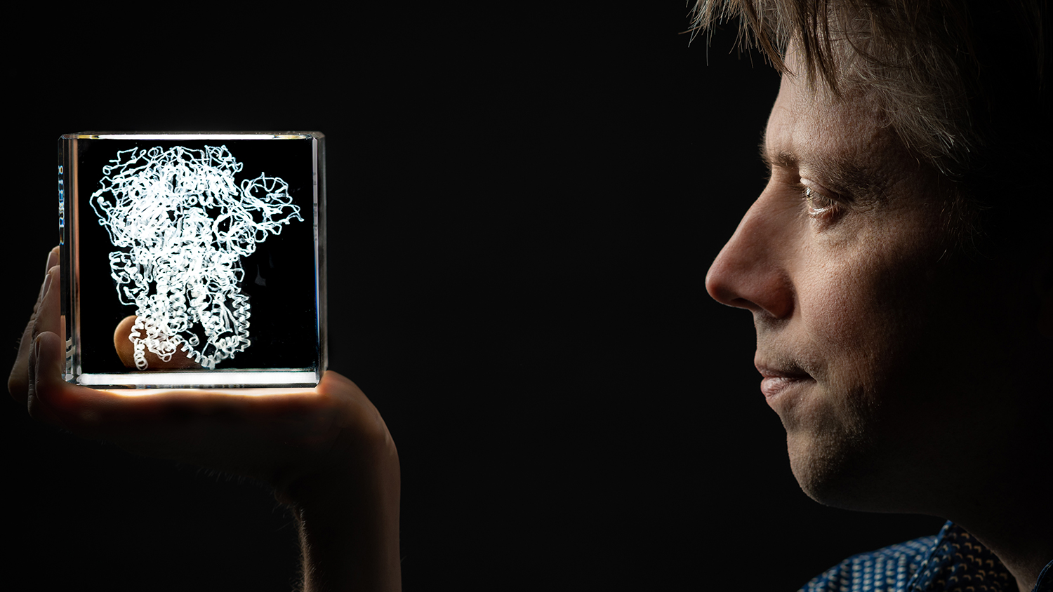 Berend Jan Bosch looks at a ‘spike complex’, the element that a virus uses to enter a host cell. Photo: Bas Niemans.