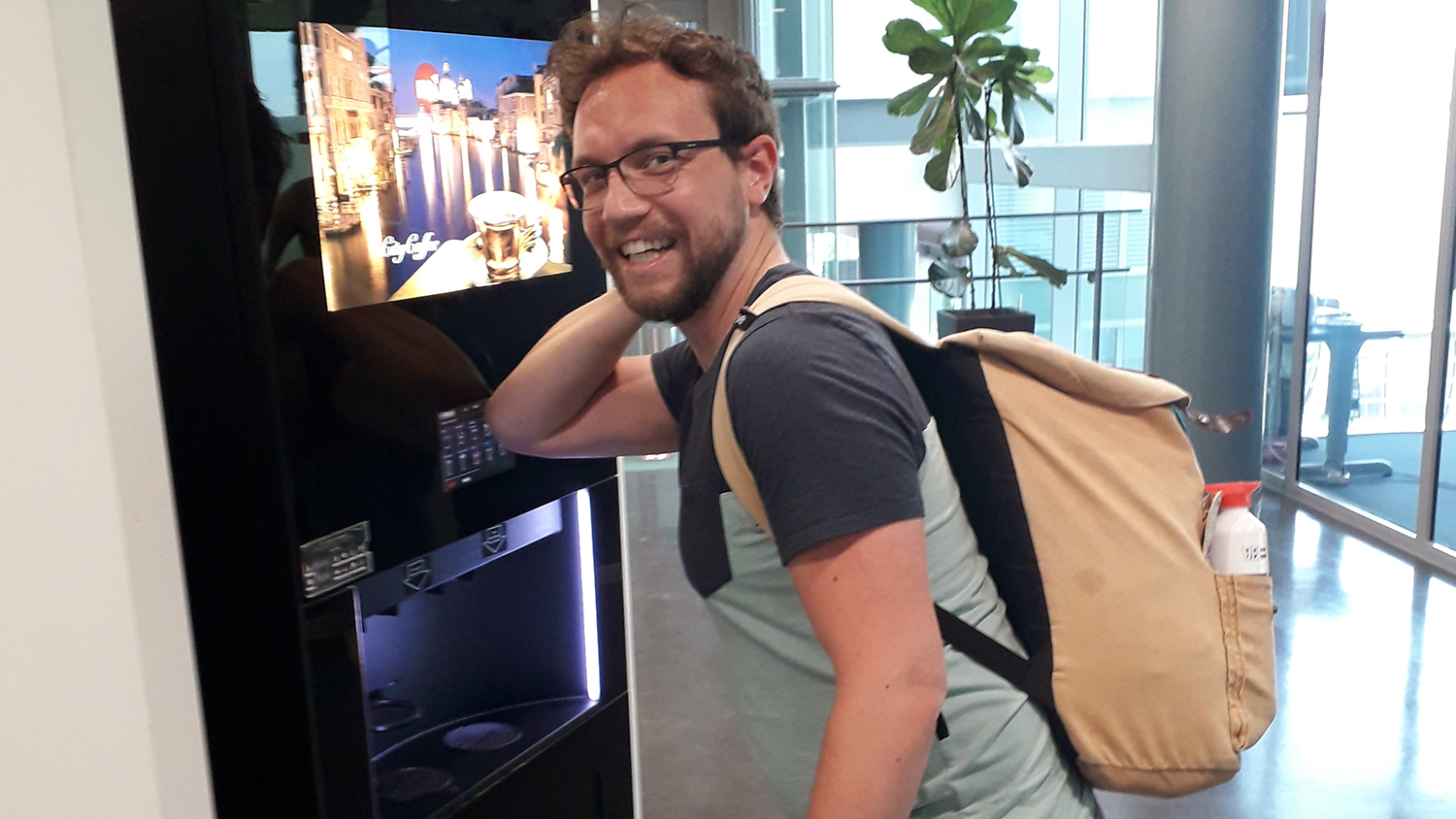 'New style' coffee ordering in the De Wiedgebouw. PhD candidate Luc Smulders makes an attempt. Photo by Petra de Jongh