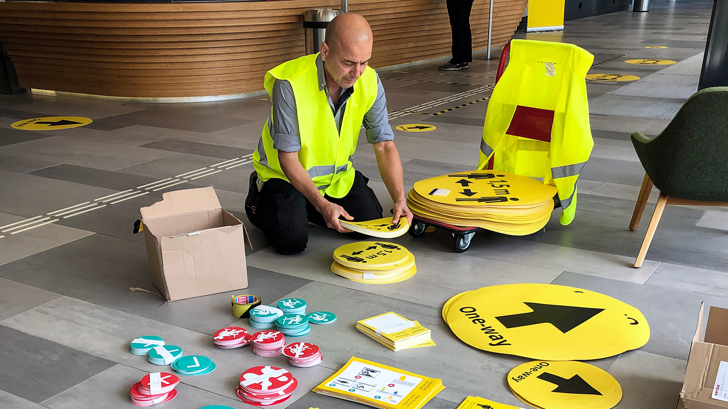 Late last week, all buildings were equipped with information boards. Stickers were stuck on the floors to indicate the walking routes and the maximum capacity per room, but also to clarify where employees have to line up for the lifts, and which urinals to use.
