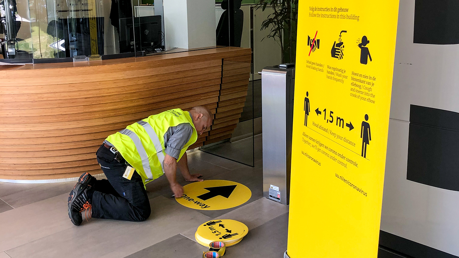 Clean your hands at the disinfection station, sign in at the reception desk, grab a stylus pen with a rubber tip to operate lifts and coffee machines, and then walk to your desk by following the one-way route that’s indicated by a path of stickers. For now, this is the new normal for UU researchers and lab employees.
