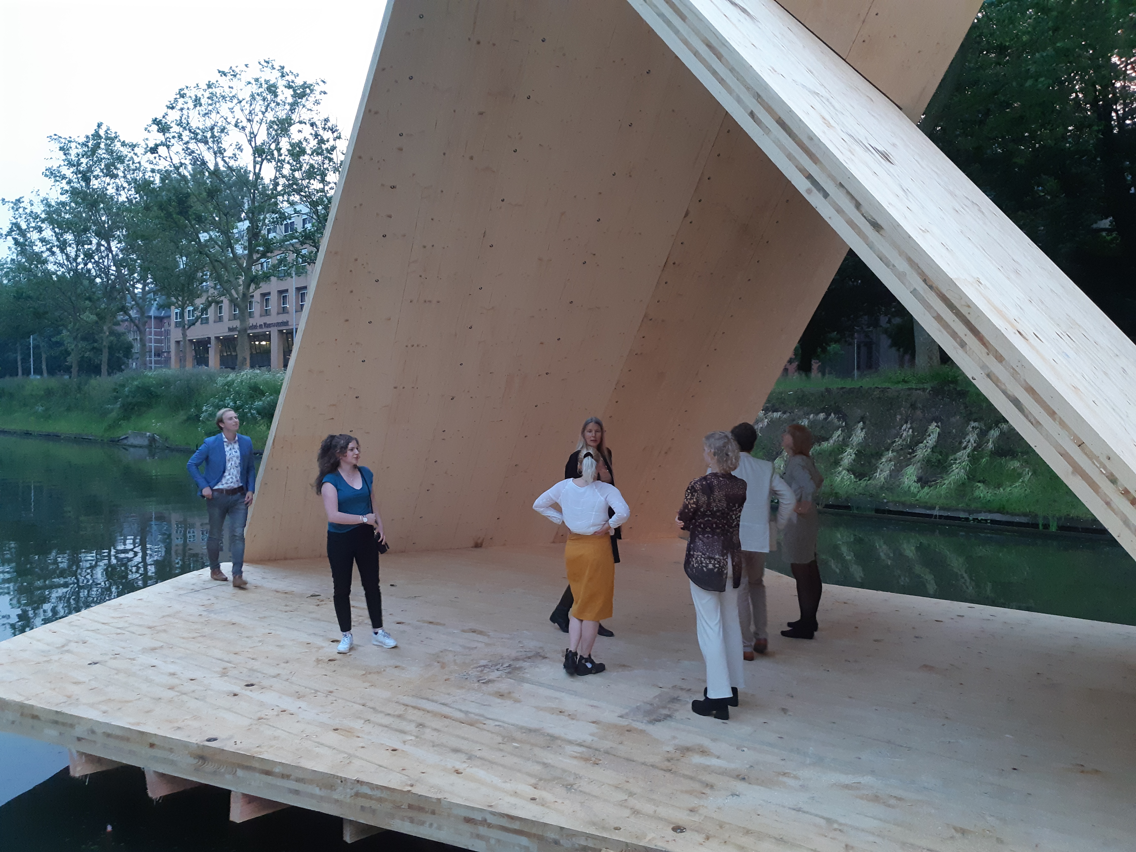“We wanted to create something that brings people together,” says Belgian artist Santiago de Waele. He and his Norwegian colleague Vibeke Jensen started building the art installation last Friday, June 25. It looks a little like a twisted tent made of wood, floating on the water. Jensen: “We came up with this construction by playing with origami, the art of folding paper. It’s very open, yet sturdy.”