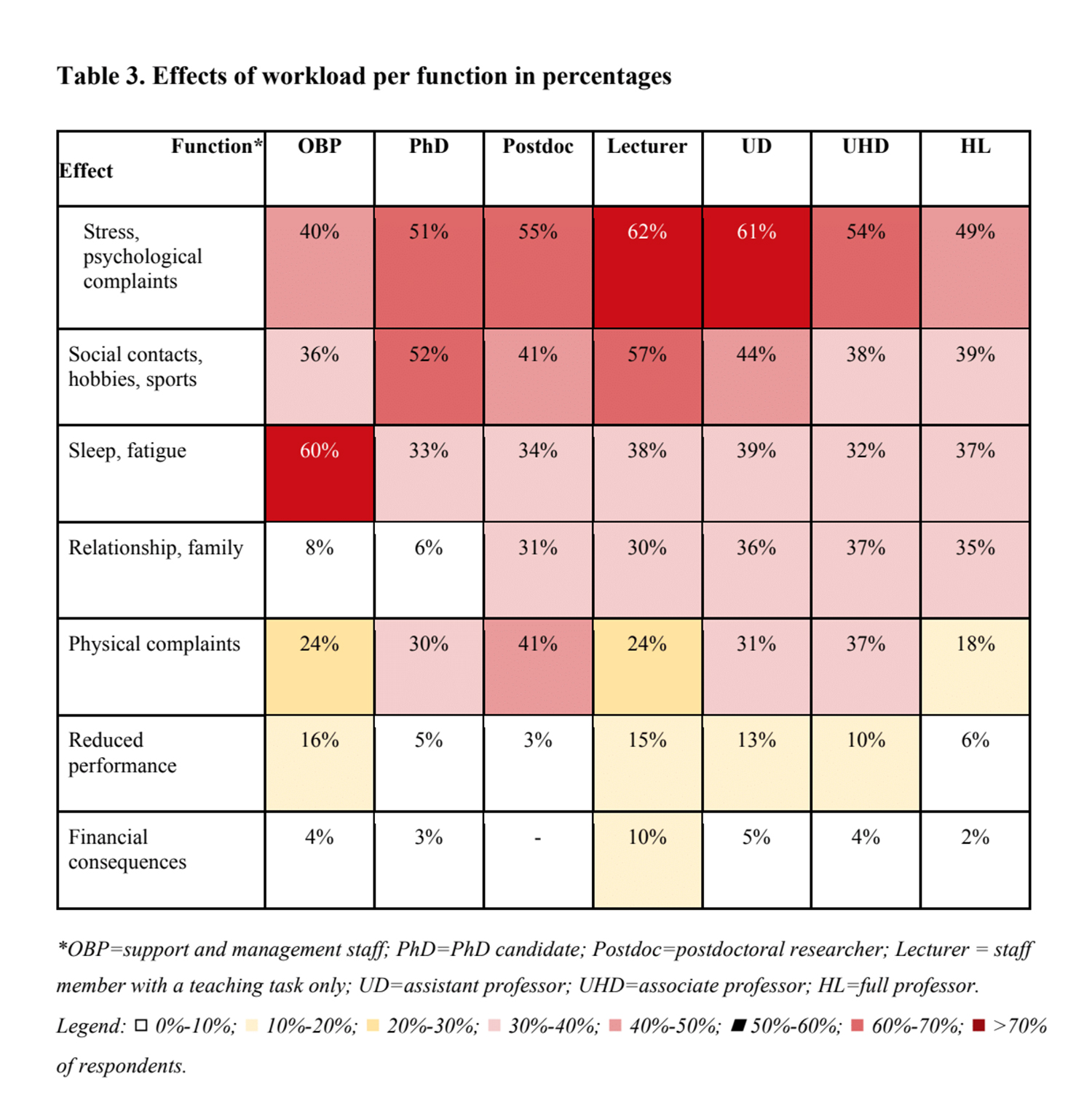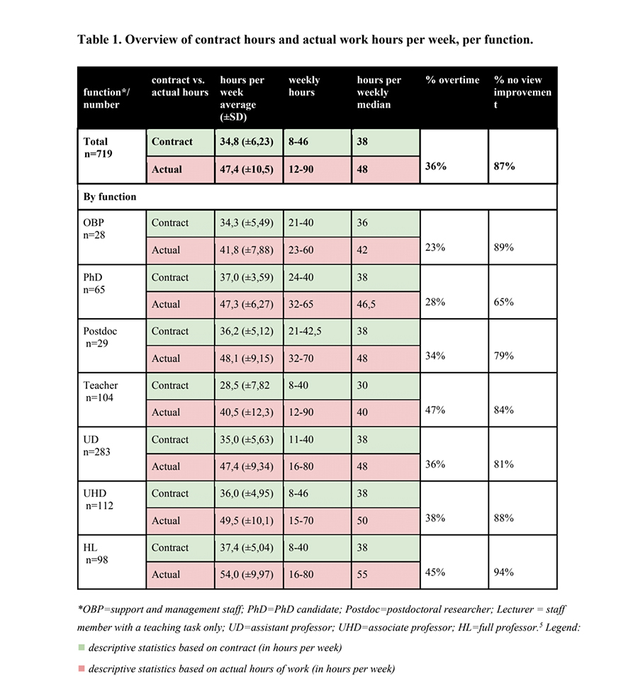 The complaints have been brought together in a brief report. The employees who responded to the call said they structurally work around 12 to 15 hours of overtime a week. Professors and teachers with an education-only position tend to work the most overtime (an average of 45 percent overtime), followed by senior lecturers (35 percent) and employees with a research-only contract (30 percent). Administrative staff say they work overtime 25 percent of the time.