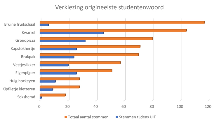 De eigenpijper (iemand die erg vol van zichzelf is) en het kapstokhertje (een meisje dat wacht tot ze opgepikt wordt in de kroeg), werden door de studenten tijdens de UIT op een gedeelde plaats gezet. Op het woord ‘sekshemd’ voor uitnodigende kleding werd maar één keer gestemd. Opvallend is dat de uiteindelijke winnaar niet in de smaak viel tijdens de UIT; maar zes mensen gaven aan de 'bruine fruitschaal' het origineelst te vinden.
