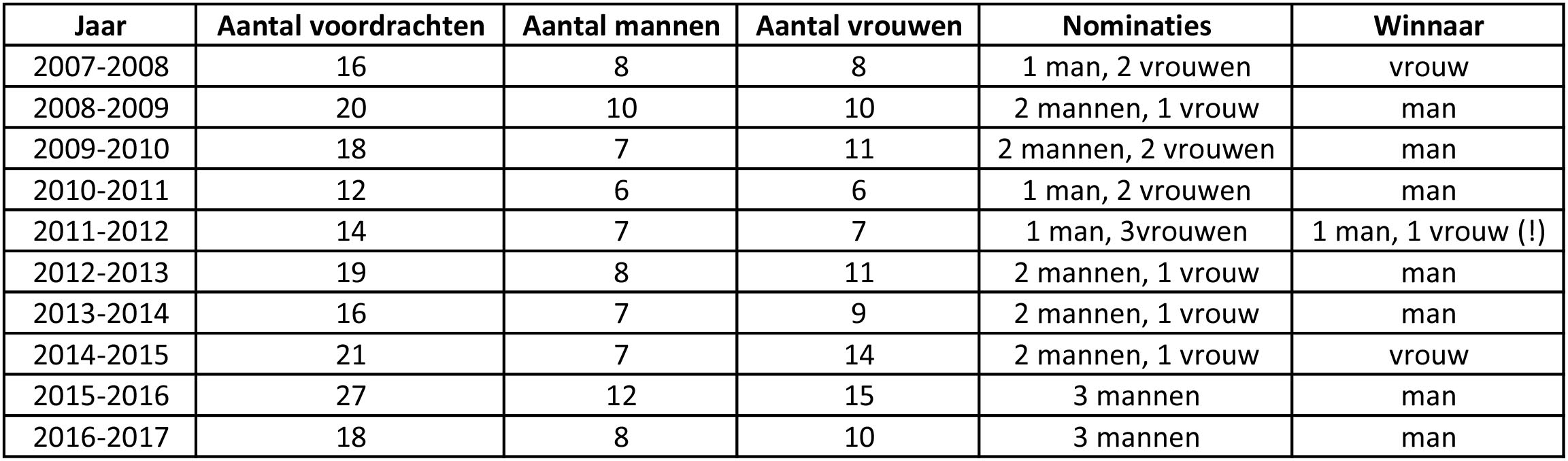 De afgelopen tien jaar opgeteld is de verdeling bij de voordrachten: 101 vrouwen en 80 mannen. Bij de nominaties zijn de verhoudingen al gekenterd: 13 vrouwen en 19 mannen. Kijken we naar wie er uiteindelijk de prijs winnen dan tellen we slechts 3 vrouwen en 8 mannen.