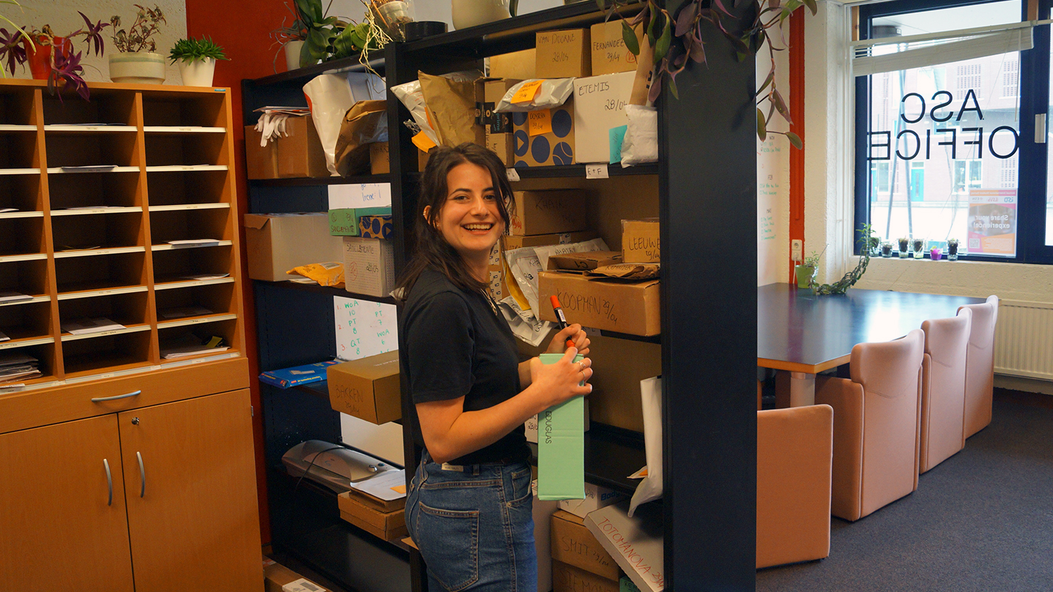 “Ik ben heel blij om hier te werken. Ik woon hier op de campus en je merkt dat je de andere studenten veel minder ziet. Nu heb ik tenminste contact. Om corona te voorkomen houden wij wel afstand. De tafel staat op anderhalve meter en de studenten komen niet de kamer in. Wij vragen de studenten ook een eigen pen mee te nemen als ze voor ontvangst tekenen.”