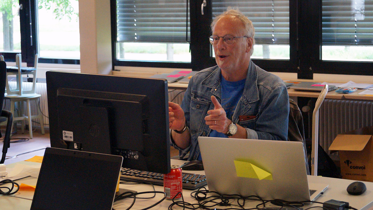“Ik vind het geweldig dat ik hier kan werken. Het is goed voor mijn discipline. Je spreekt nog aardig wat collega’s die hier rondlopen. De beveiliging zit hier, de schoonmaak is heel actief. En mooi dat je mensen persoonlijk kunt helpen, bijvoorbeeld met een nieuwe laptop en alle benodigde programma’s. Het is wel uitkijken, want ik behoor wel tot de risicogroep. Wij werken dus als vast team met zijn tweeën. We hebben overal dubbele bureaus om afstand te houden. We maken gebruik van handschoenen en we hebben de gel hier binnen handbereik.”