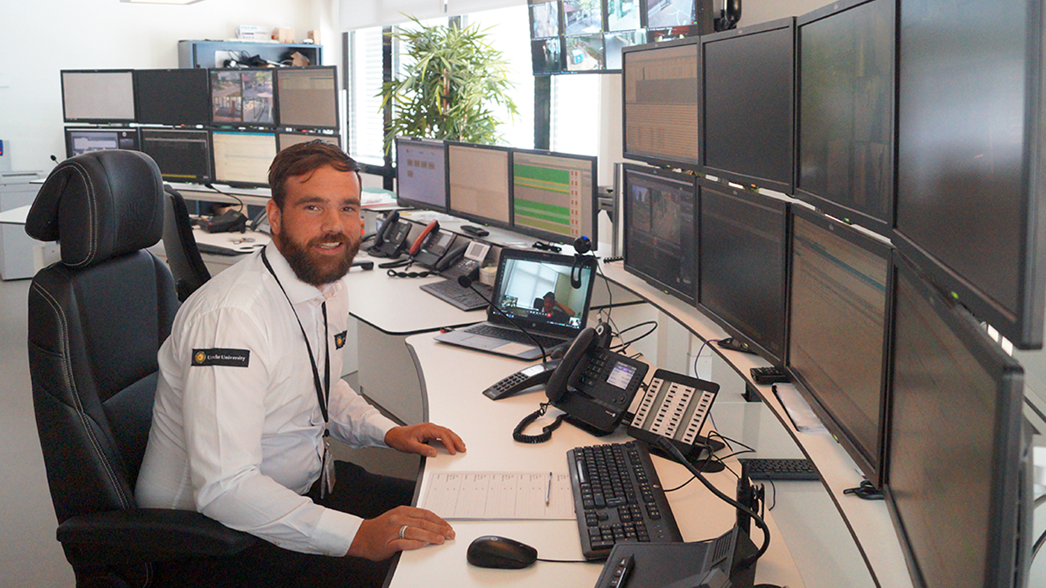 “Ik ben senior beveiliger en coördineer de lopende beveiligstaken van de UU. We zitten hier in de meldkamer waar we een overzicht hebben van alle gebouwen van de universiteit. Daarnaast hebben we een buitendienst die rondes maakt. Wij zijn 24 uur verantwoordelijk voor de beveiliging.”