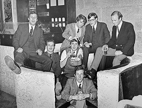 De eerste discobarcommisie in de houten zitcirkel, later 'Apenrots' genoemd.