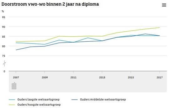 De doorstroom van vwo naar wo bleef zelfs stijgen na de invoering van het leenstelsel. Het aandeel vwo’ers uit gezinnen met de hoogste inkomens dat binnen twee jaar naar de universiteit ging, groeide van bijna 88 procent in 2015 naar bijna 90 procent in 2017. Bij de laagste twee welvaartsgroepen bleef de doorstroom stabiel op ruim 85 procent.