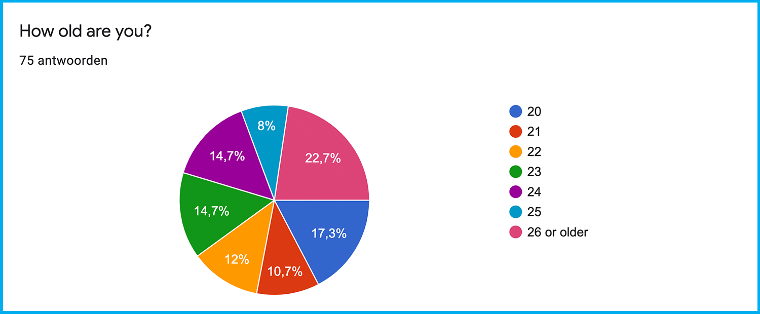 Het merendeel van de respondenten van onze enquête was vrouw (72 procent). Ook waren de meeste deelnemers 26 of ouder, wat logisch is aangezien 55 procent van de respondenten in Utrecht is voor een masterstudie. En studenten uit Duitsland en Italië waren onder onze respondenten het best vertegenwoordigd: uit elke landen deden 10 studenten mee.