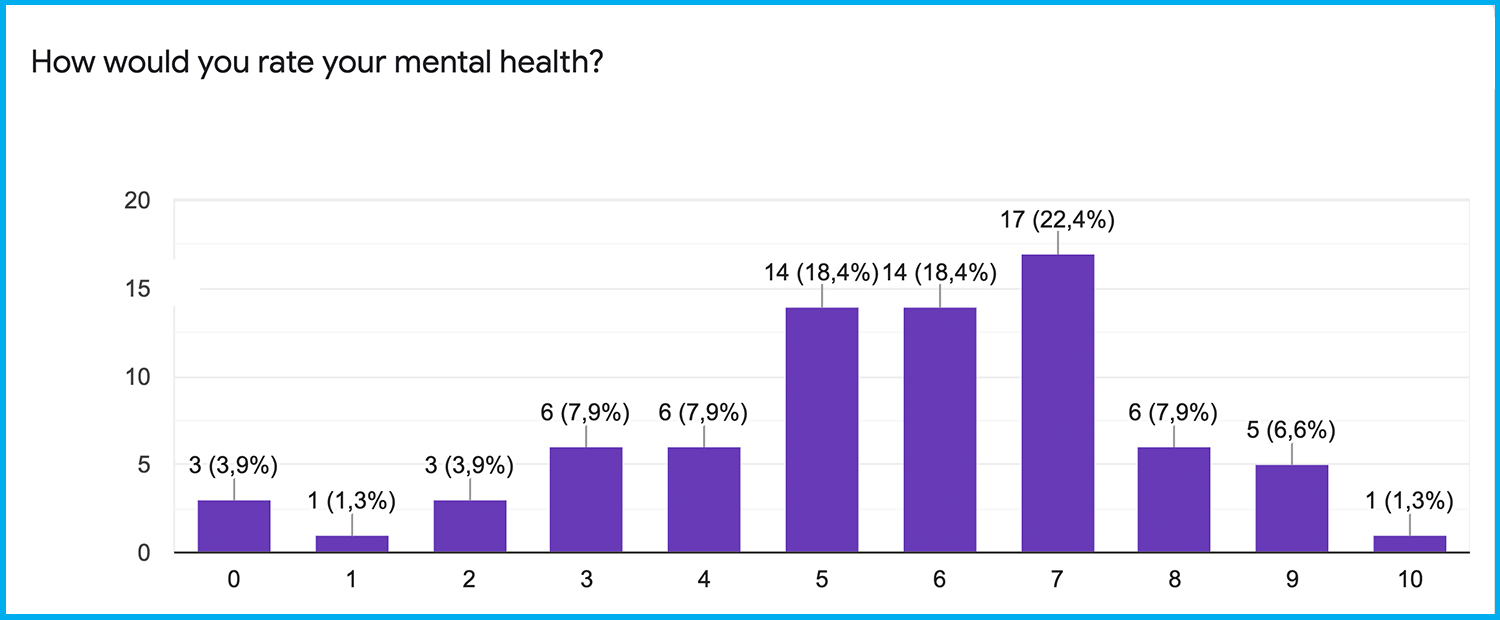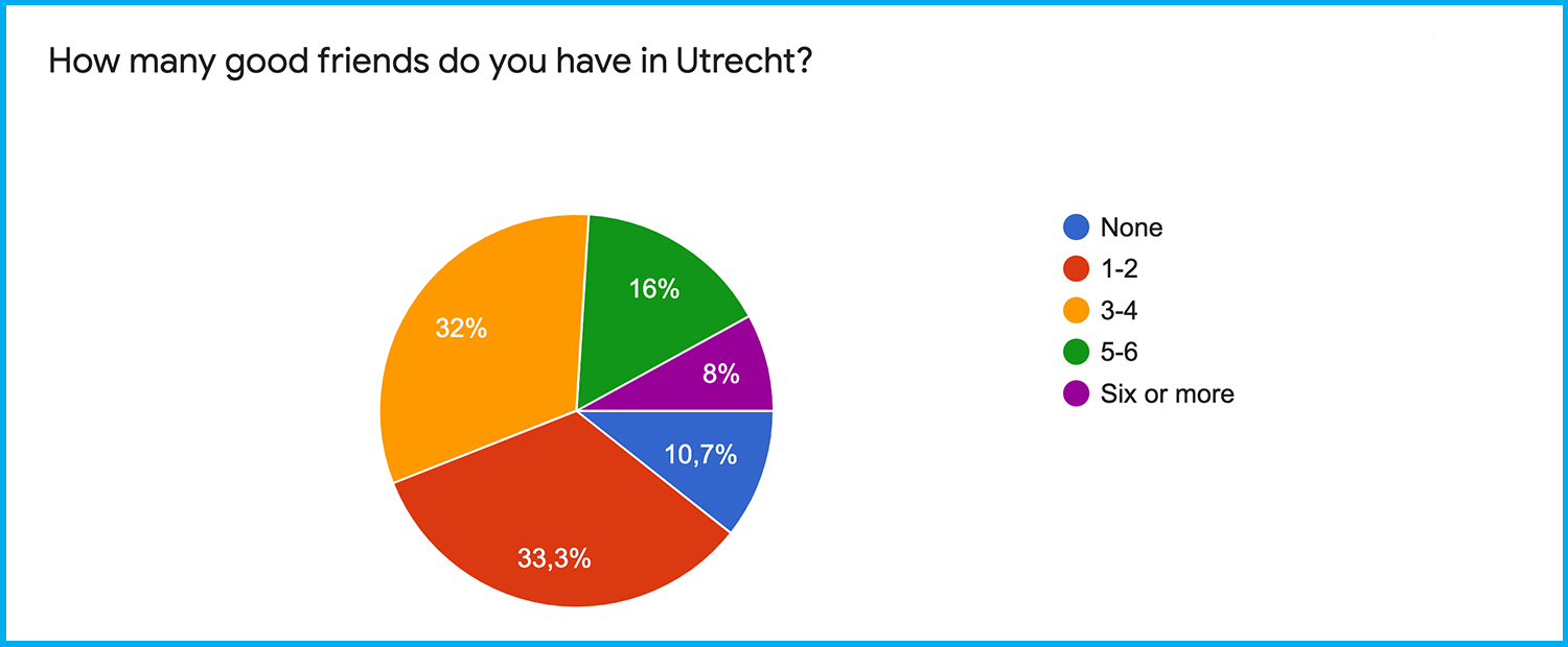 Alice is blij dat het haar lukte vrienden te maken in Utrecht ondanks de pandemie. Ze zegt dat ze zich verbonden voelt met de universiteit. Een belangrijke reden daarvoor is het feit dat ze het merendeel van de tijd fysiek onderwijs kreeg. De meeste van haar vrienden zijn dan ook studiegenoten van haar master, maar ze ontmoette ook andere internationale studenten tijdens de Introductieweek. “Ik wilde eigenlijk niet gaan omdat ik dacht dat ik genoeg mensen zou ontmoeten in mijn studie, maar ik ben zo blij dat ik toch geweest ben”. Ze maakt ook deel van de Radio Life Sciences podcast, waar ze veel mensen door heeft ontmoet. Nu heeft Alice drie tot vier goede vrienden, en geeft ze haar mentale gezondheid een 7, net als de meeste respondenten.