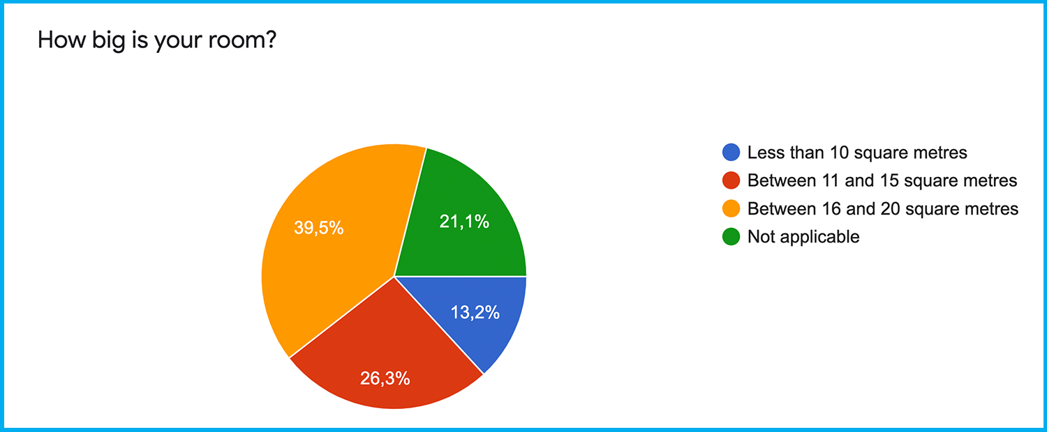 Uit onze enquête bleek ook dat de kamers van internationale studenten relatief groot zijn: bijna 40 procent woont in een kamer van 16 tot 20 vierkante meter. Alice wijkt wat af van dat gemiddelde en behoort tot een minderheid van internationale studenten (13 procent) die in kamers van 10 vierkante meter of kleiner woont. “Het was niet makkelijk om in zo’n kleine kamer te wonen tijdens corona, maar ik bleef mezelf eraan herinneren dat ik met het hebben van een kamer al een van de gelukkigen was”, zegt ze.