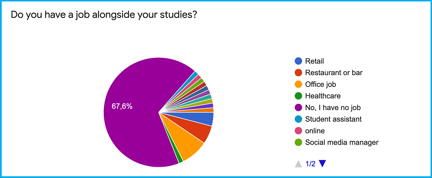 Net zoals 67 procent van de DUB-enquête respondenten, werkt Alice niet naast haar studie. Haar ouders betalen haar studiekosten en levensonderhoud, net zoals de ouders van de helft van de respondenten dat doen. 22 procent van de respondenten betaalt de master met spaargeld, dis is de tweede meest populaire manier om de studie te betalen.