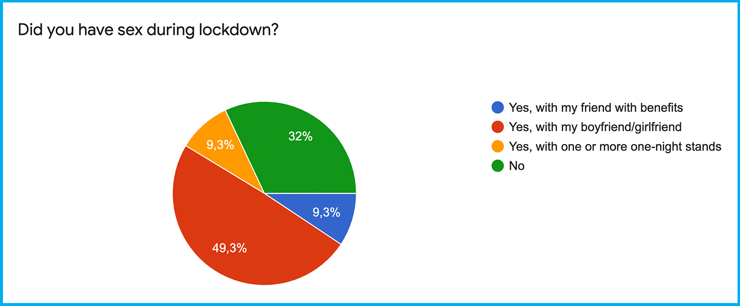 Volgens onze enquête heeft 60 procent van de internationale studenten een serieuze relatie. Toen ze onze vragenlijst beantwoordde, was Alice een van de weinigen die aangaf dat het “ingewikkeld” was, maar nu bevestigt ze dat ze inmiddels tot de grootste groep behoort: het is net serieus geworden met een Nederlandse jongen die ze ontmoet heeft op Tinder. Deze app werd klaarblijkelijk weinig gebruikt door internationale studenten toen Nederland in lockdown was: 32 procent van de respondenten had helemaal geen seks in deze periode. Slechts 9 procent had een of meer onenightstands tijdens de lockdown.
