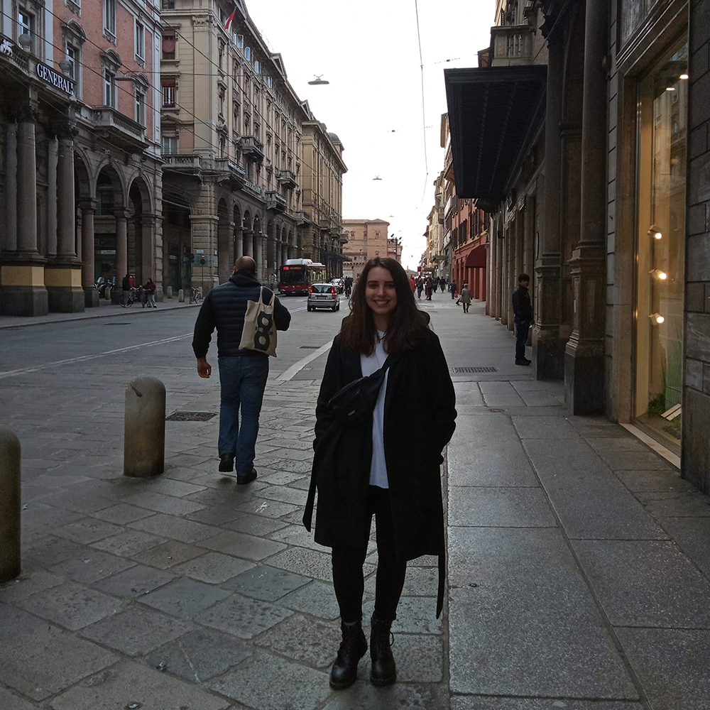 Geschiedenisstudent Ellen Linderhof tijdens een van haar laatste dagen in Bologna, eigen foto.