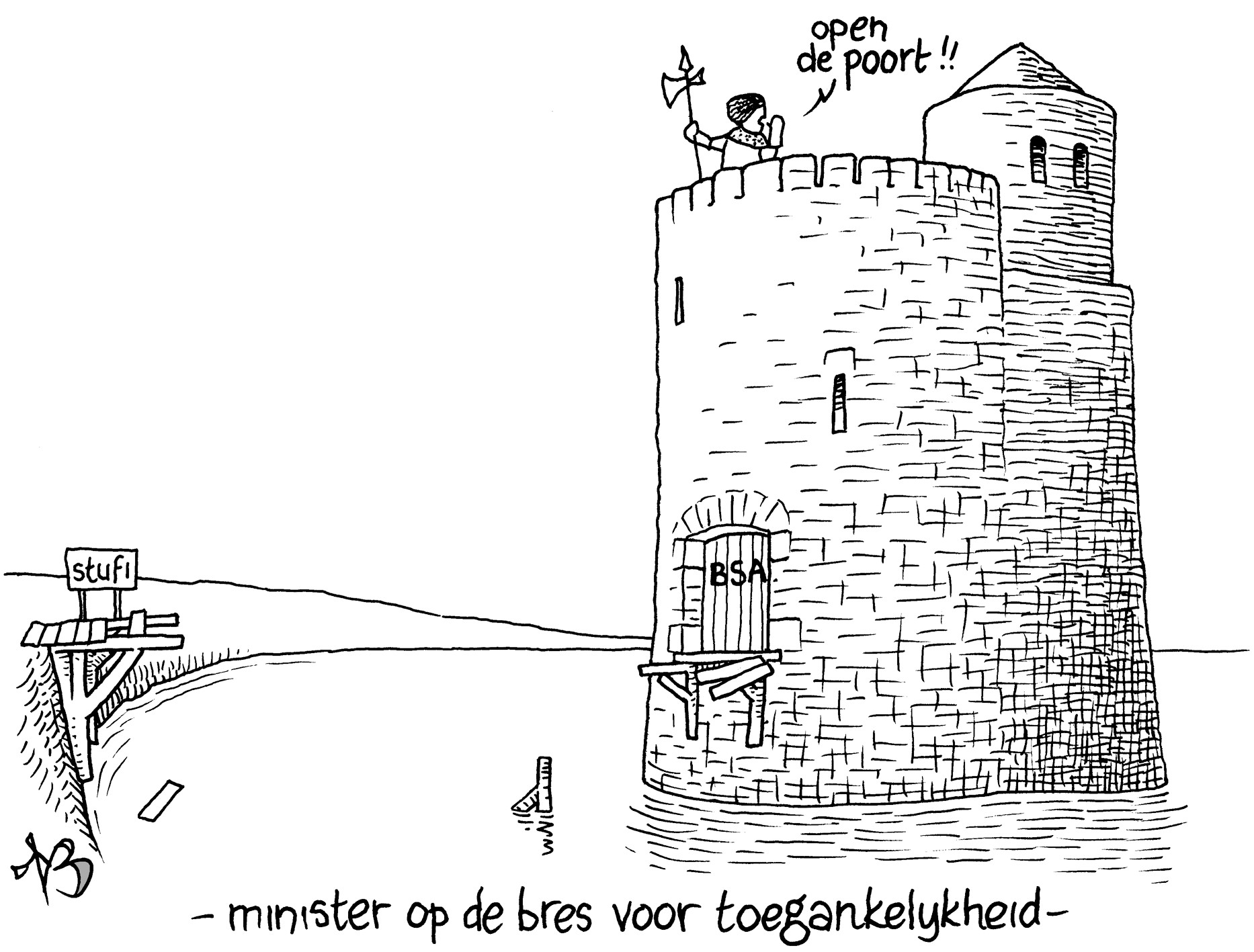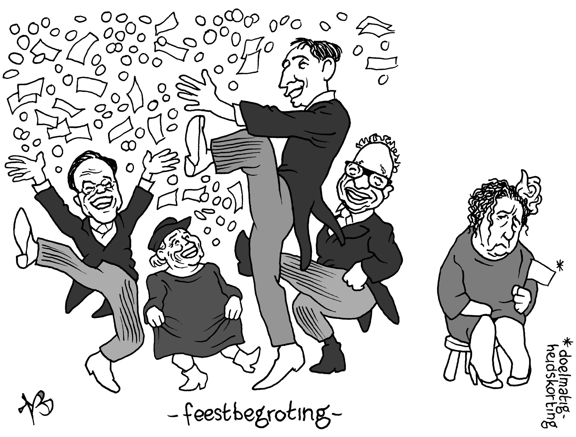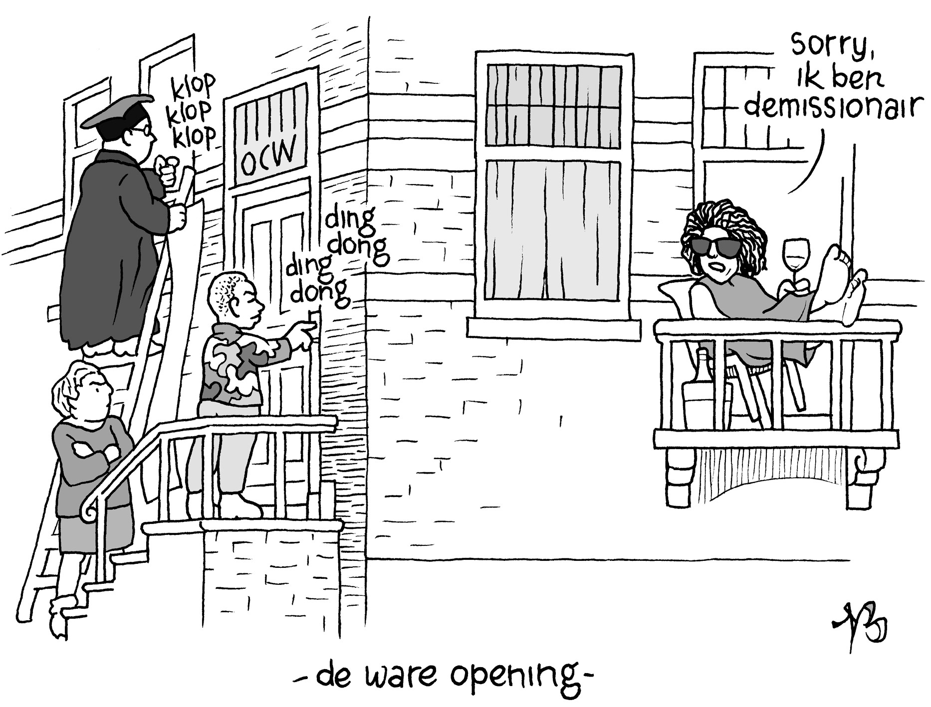 Als tekenaar was ik trouwens best blij met Van Engelshoven. Haar haardos maakt haar van verre herkenbaar, en dan heeft ze ook nog een tamelijk expressief gezicht dat zich makkelijk laat plooien naar de voor de tekening gewenste emotie - al liet ik haar, voor het komische effect, toch vooral zorgelijk of ernstig kijken.