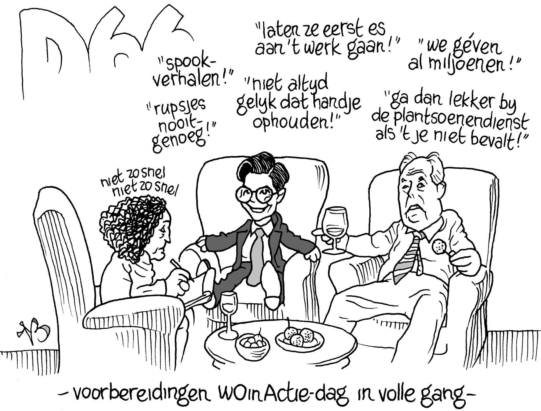 December 2018. Een jaar verder, en er was in de Onderwijsbegroting niets gebeurd voor het hoger onderwijs. WOinActie kondigde een actiedag aan, met zelfs een onderwijsstaking. De partij van de minister -u weet wel, de Onderwijspartij- vond het allemaal maar overdreven. Zo beweerde Kamerlid Paul van Meenen, woordvoerder onderwijs (rechts, met bitterbal), dat de instellingen nog miljoenen ongebruikt op de plank hadden liggen. Niet dat de andere partijen in de coalitie er anders over dachten, maar dit terzijde.