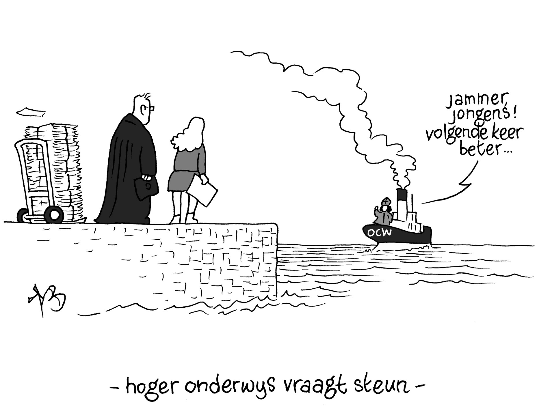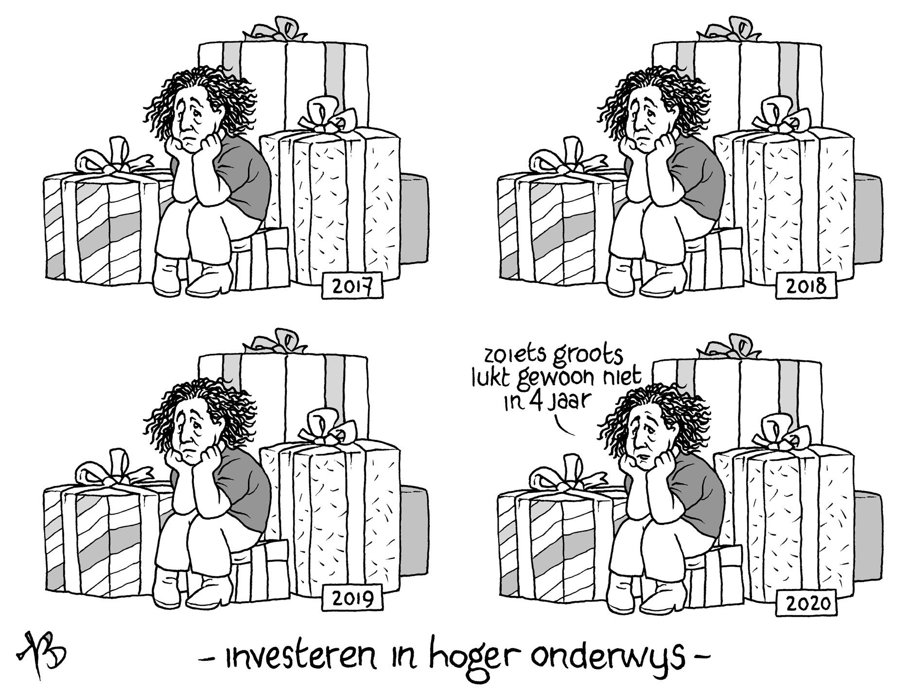 December 2017. M’n eerste cartoon waarin Van Engelshoven figureert, en meteen een kenmerkende - al kon ik dat toen natuurlijk nog niet weten. WOinActie en een bevlogen studente hadden een overweldigende hoeveelheid handtekeningen opgehaald bij personeel en studenten om meer aandacht en geld te bepleiten in de Onderwijsbegroting. In het Kamerdebat -vlak voor Sinterklaas- hield de minister alles af en beloofde ze alleen er later nog eens naar te kijken.