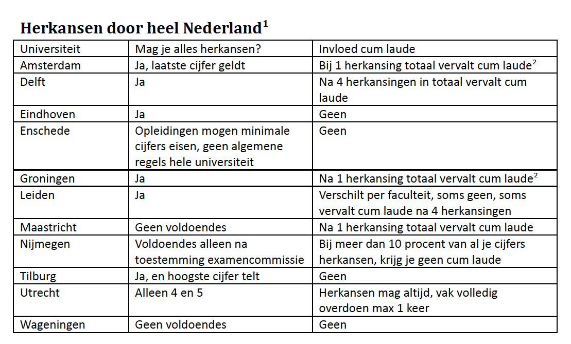 De studenten vinden dat de reparatieregel de Utrechtse student ook benadeelt. Eva heeft een vergelijking gemaakt met herkansingregels van een aantal andere Nederlandse universiteiten (zie onderstaande tabel). “Ik kom tot de conclusie dat geen enkele universiteit zo streng is als Utrecht.”