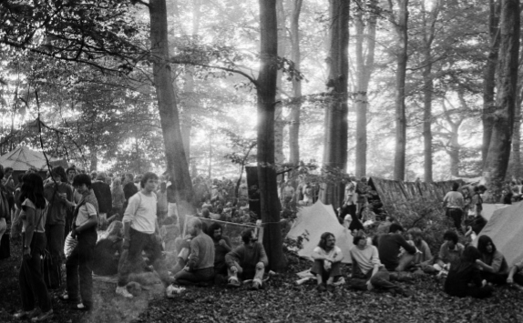 Op de houten vloer ontstaan her en der vochtplekken door gemorst bier. De menigte dunt uit. Dit is een borrel die snel piekt en weer uitdooft, als een fikkende berg tuinafval. Ik neem op weg naar de uitgang een moment om het boek door te bladeren waar het allemaal om gaat. In de jaren tachtig werd Amelisweerd bezet om houtkap te voorkomen. Op een zwart-witfoto zie je de actievoerders zitten, eensgezind tussen de bomen. Er schijnt een helder wit licht tussen het loof door.