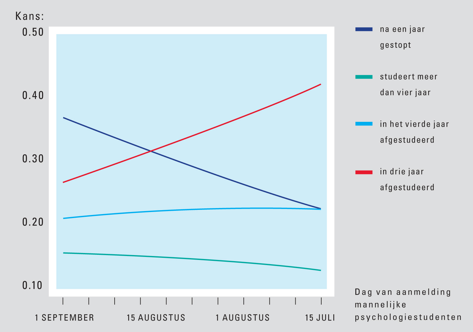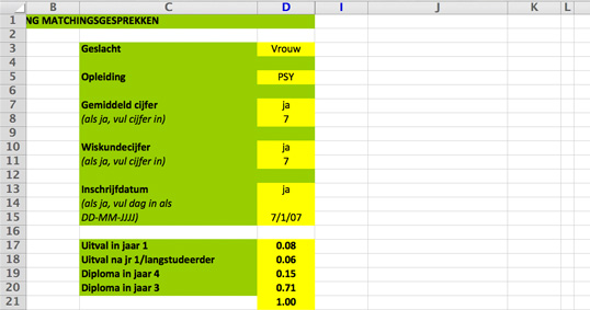 Hoe verrassend groot de impact van elk van deze parameters is op het studiesucces van een individuele student, demonstreert Van der Heijden op zijn laptop met behulp van een zeer eenvoudig ogend Excel-programma. “Laten we een vrouwelijke psychologiestudent nemen. Ze heeft een 7 als eindexamen- en als wiskundecijfer en schrijft zich relatief vroeg in. De kans dat zij in drie jaar haar studie haalt is 71 procent. Als ik daar nu een mannelijke student van maak dan is die kans nog maar 56 procent. En als ik dan ook nog een 6 als eindexamen- en wiskundecijfer neem en een latere inschrijfdatum invoer, is die kans nog maar 24 procent.”