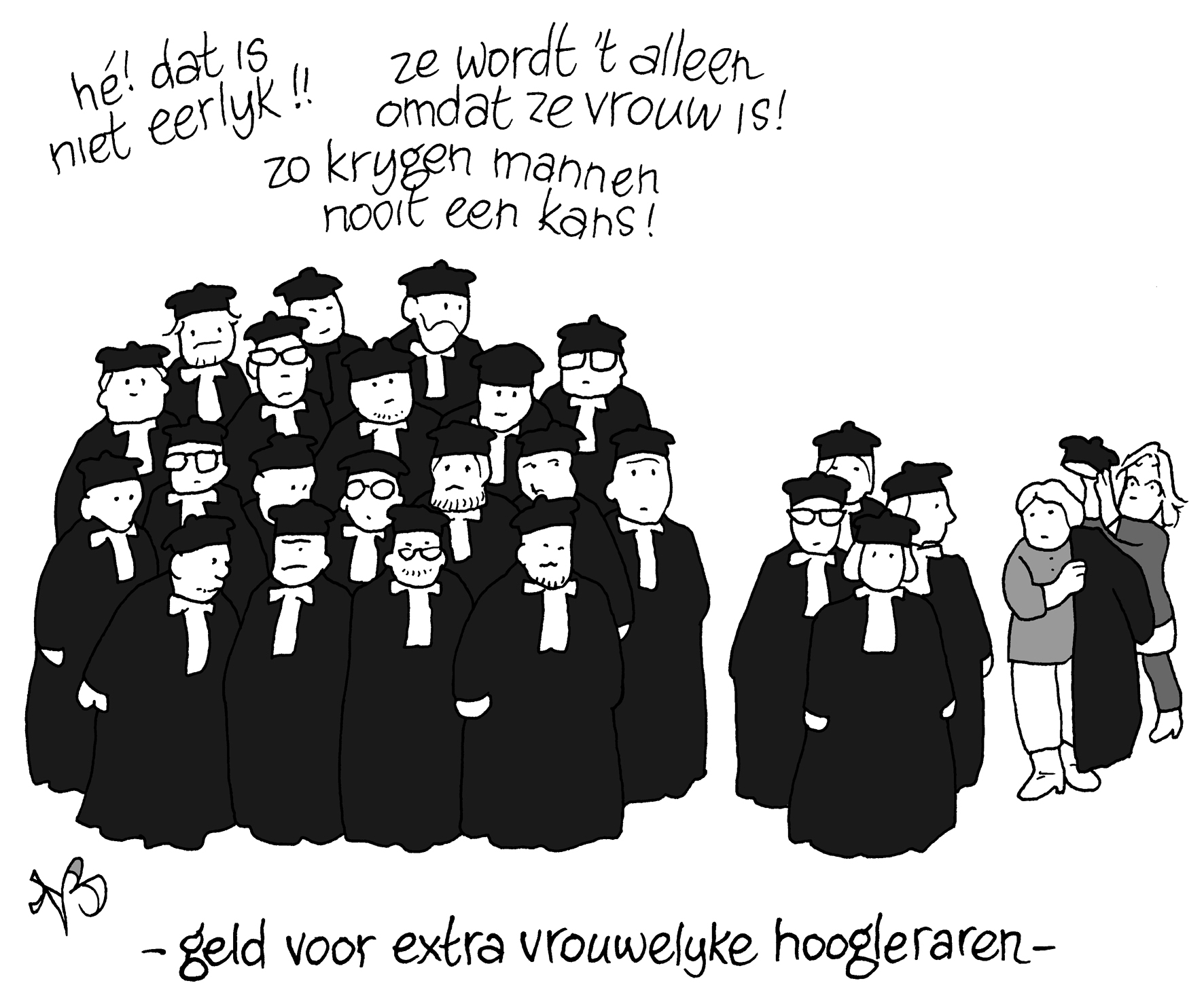Januari 2017. Leuke actie van Bussemaker aan het eind van haar regeerperiode: ze reserveerde budget om de komende jaren een flink aantal vrouwen als hoogleraar aan te stellen. Reacties lieten zich raden. De verhouding tussen mannelijke en vrouwelijke hoogleraren in de tekening komt trouwens overeen met die verhouding in de werkelijkheid - dus je zou ook kunnen zeggen dat het budget een druppel op een gloeiende plaat is.