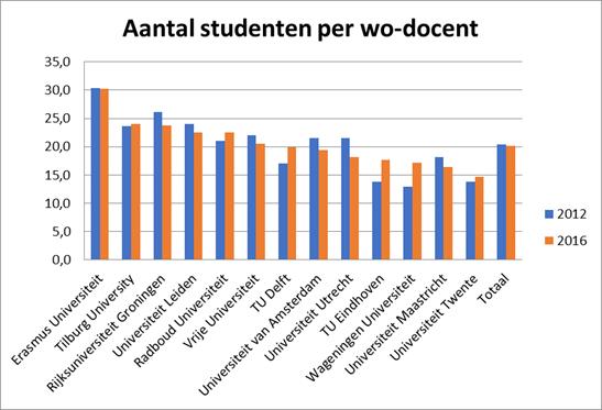 En dan blijken er aan de universiteiten in de praktijk juist iets minder docenten te werken dan in 2012. Het scheelt bijna niets, maar in 2012 telden de universiteiten 25,4 studenten per docent. Nu zijn dat er 25,7.
