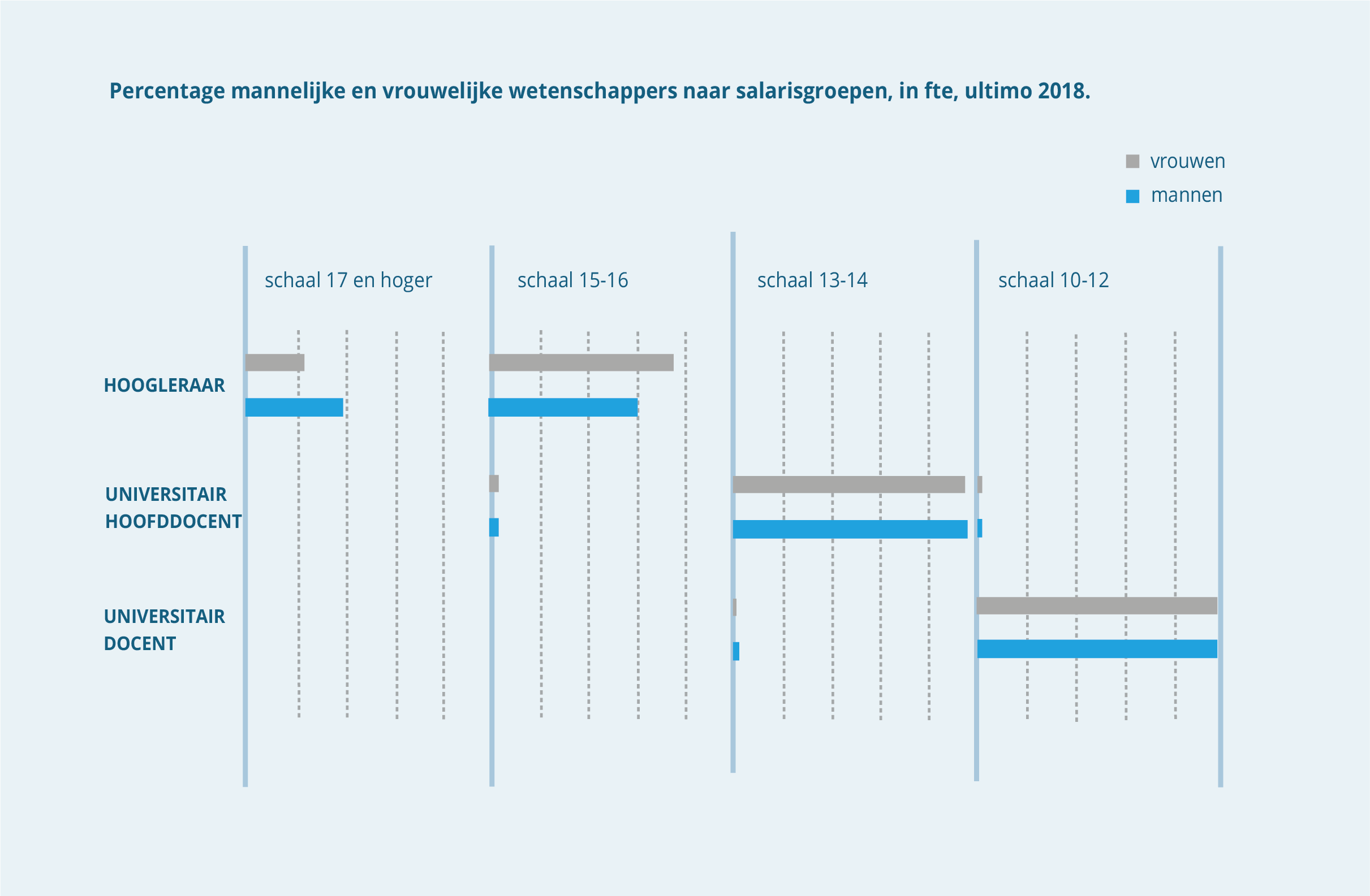 De salariskloof is het grootst onder hoogleraren. Een simpele uitleg van de cao luidt: voor hoogleraren gelden schaal 15 en 16 als 'laag' salaristarief en schaal 17+ als 'hoog' salaristarief. Wat blijkt? De relatieve groep mannen in schaal 17+, is 40 procent groter dan de groep vrouwen in die schaal.
