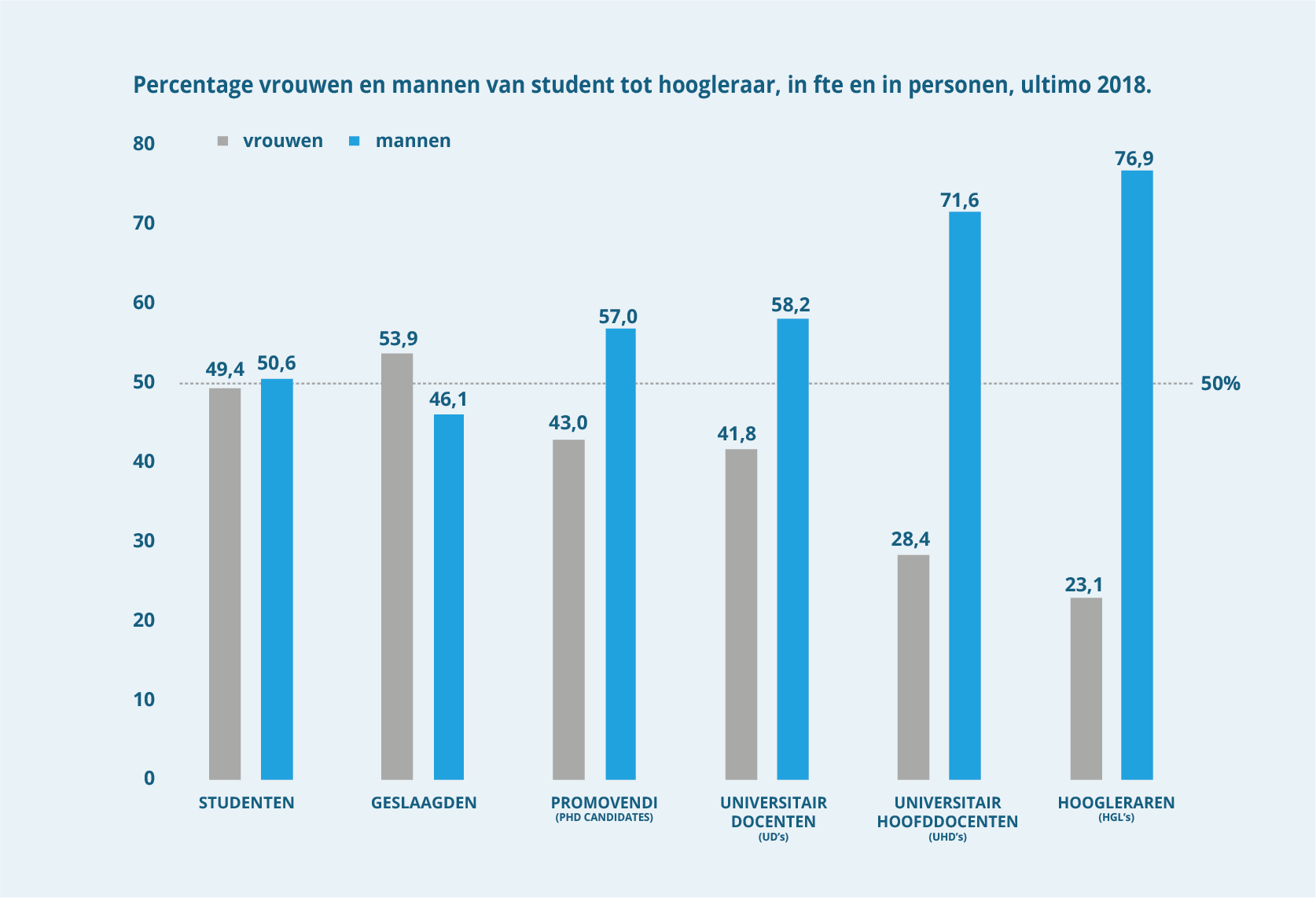 Bron: Monitor Vrouwelijke Hoogleraren 2019, LNVH, via 1cHO2018, VSNU, WOPI. Studenten en geslaagden: in personen. Overig: in fte. Alles exclusief wetenschapsgebied gezondheid.