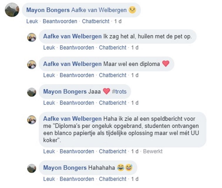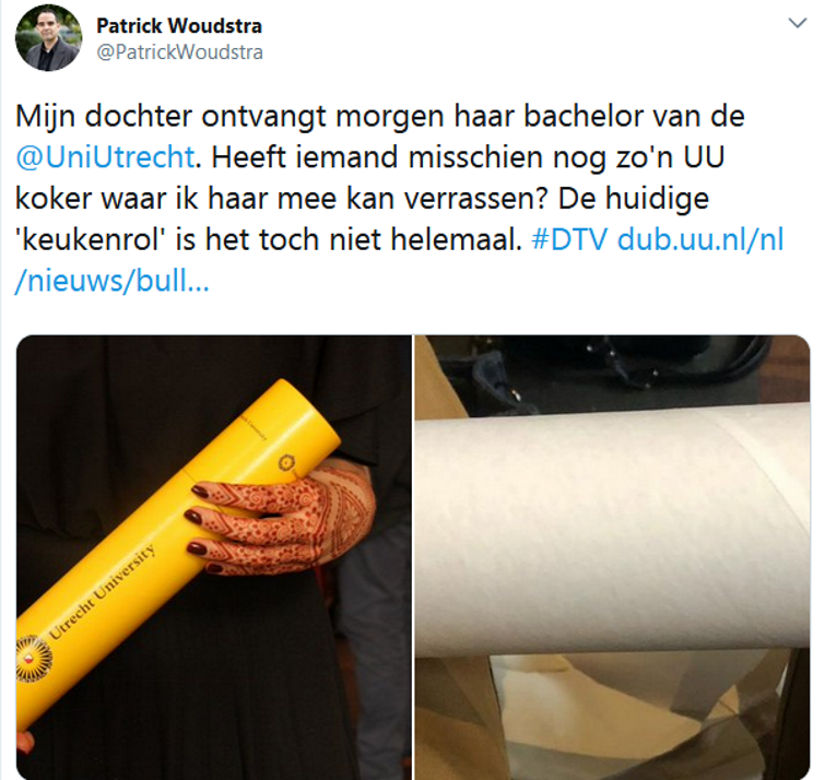 Ook op Twitter kwam er een reactie binnen: daar zocht een trotse vader een mooie koker om zijn dochter mee te verrassen bij haar buluitreiking. Een chique UU-koker vinden is niet gelukt, maar vanaf half november zouden de UU-kokers wel weer terug moeten zijn. Of de blanco kokers dan in te wisselen zijn voor de UU-kokers? De universiteit moet er nog een besluit over nemen.