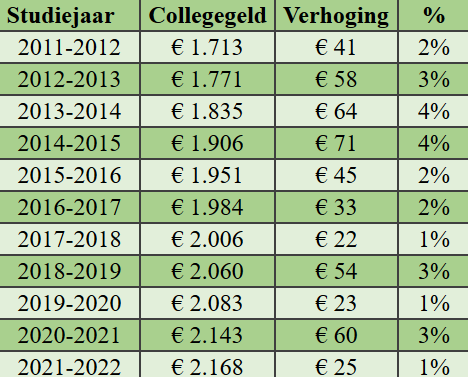 Het is een kleinere verhoging dan vorig jaar, toen het collegegeld nog steeg met 60 euro. In 2014 ging het zelfs met 71 euro omhoog.