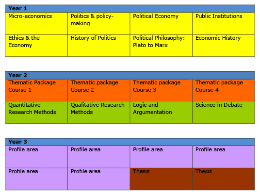 De bachelor Philosophy, Politics and Economics (PPE) combineert vakken van de opleidingen Filosofie, Geschiedenis, Economie en Bestuurs- & Organisatiewetenschap. Volgens de faculteiten is er vraag naar een dergelijke brede opleiding in Nederland. Bovendien sluit de bachelor mooi aan bij het strategische onderzoeksthema Institutions for Open Societies én bij de wens van het universiteitsbestuur voor onderzoeksgedreven onderwijs.