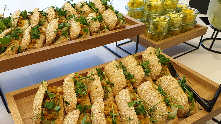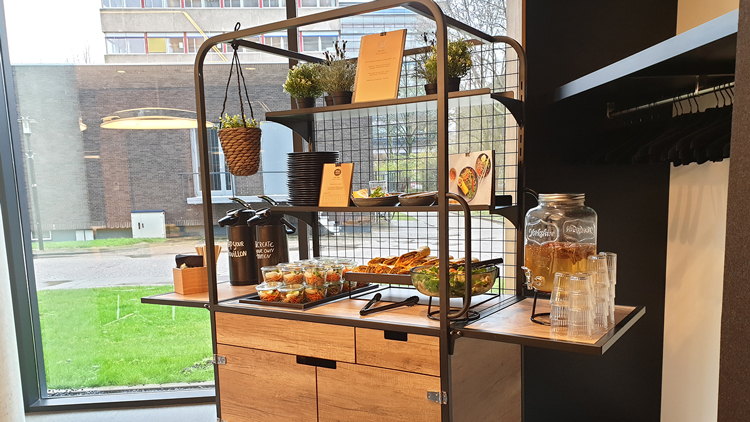 Eurest zal ook de lunches verzorgen voor universitaire bijeenkomsten. Vlak voordat de universiteit de panden sloot, is er een proeverij geweest met medewerkers. De lunches kregen mooie cijfers, zegt Stamp-Jongbloed. “Er is keuze uit vier pakketten, dat kunnen er nog meer worden. De basislunch kreeg gemiddeld een 8, de luxe lunch een 7,7.” Bij de lunch wordt standaard een doggybag geleverd zodat overgebleven broodjes meegenomen kunnen worden.