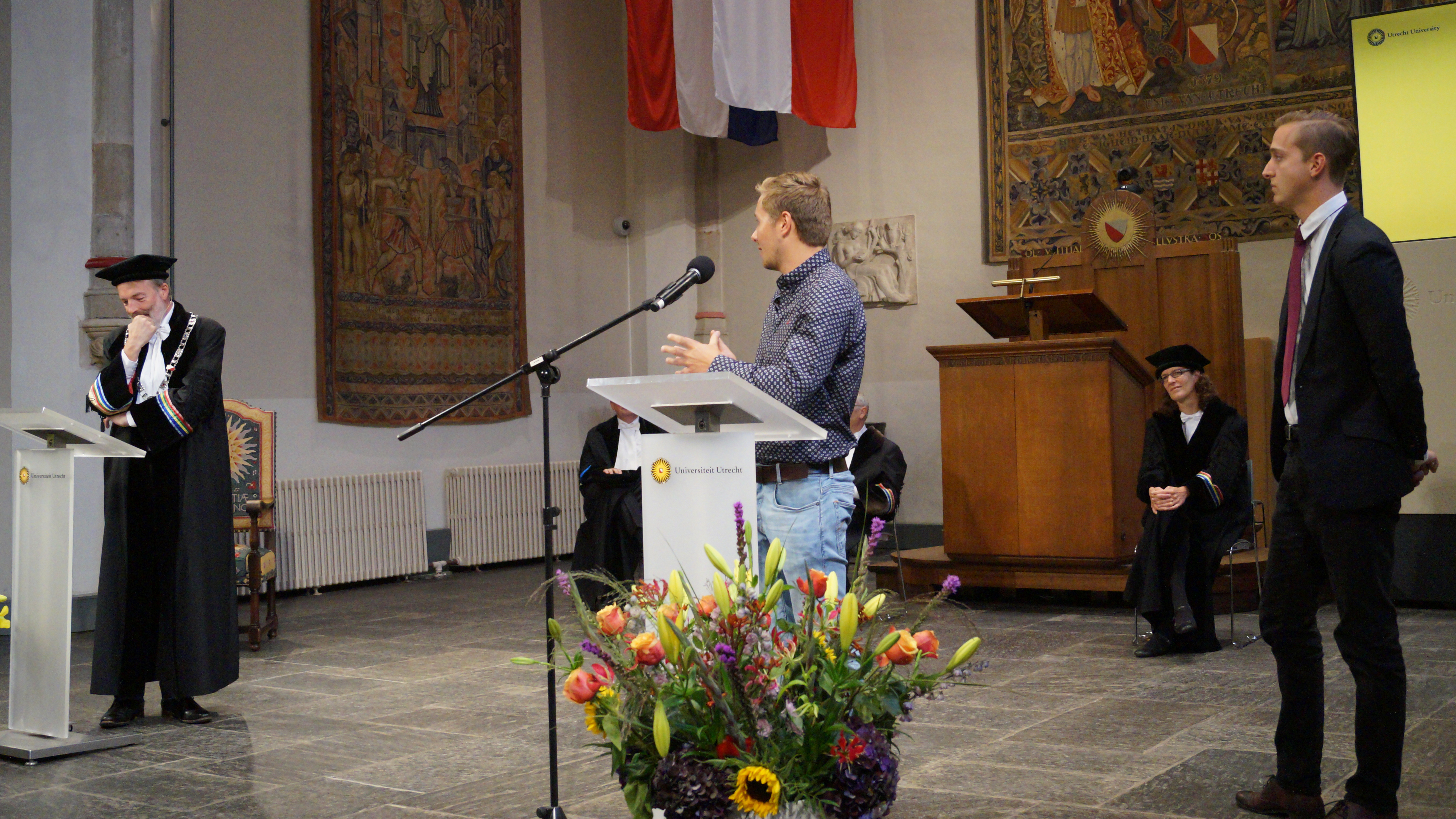 Zowel Woudwijk als de studenten van DOMcast ontvingen een oorkonde en een cheque van 1500 euro.