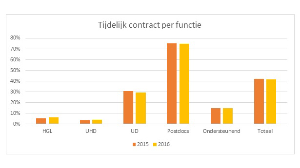 In 2016 was 41,7 procent van het universitaire personeel in tijdelijk dienst, blijkt uit de nieuwste cijfers van universiteitenvereniging VSNU. Dat is een daling van 0,3 procent ten opzichte van 2015 (zie grafiek bovenaan).