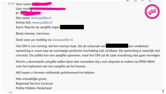 Navraag bij het OM leerde echter dat dit iets te voorbarig was. Volgens een woordvoerder heeft het OM alleen gezegd dat het bericht – hoewel het een “smakeloze opmerking” betreft – “niet per definitie strafbaar is”. Een echte juridische beoordeling wil het OM pas maken wanneer eventuele aangiften zijn bestudeerd. Dan is ook pas bekend of de man vervolgd zal worden of niet. De politie heeft laten weten dat het mailbericht inmiddels is aangepast.