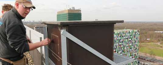 “Het is moeilijk om de slechtvalken van het gebouw af te krijgen”, legt ingenieur Jos de Vries van de UU uit. “We mogen het paar in het broedseizoen niet storen. Hier zijn door de wet beschermde dieren. We kunnen de plek na het broedseizoen moeilijker toegankelijk maken, door het veiligheidsnet tot de bovenste verdieping door te trekken. Dan kunnen de vogels niet meer op hun oude plek landen.” De volwassen slechtvalken in Nederland trekken niet. De jongen die ze krijgen, kunnen na het uitvliegen wel op een andere plek terechtkomen.