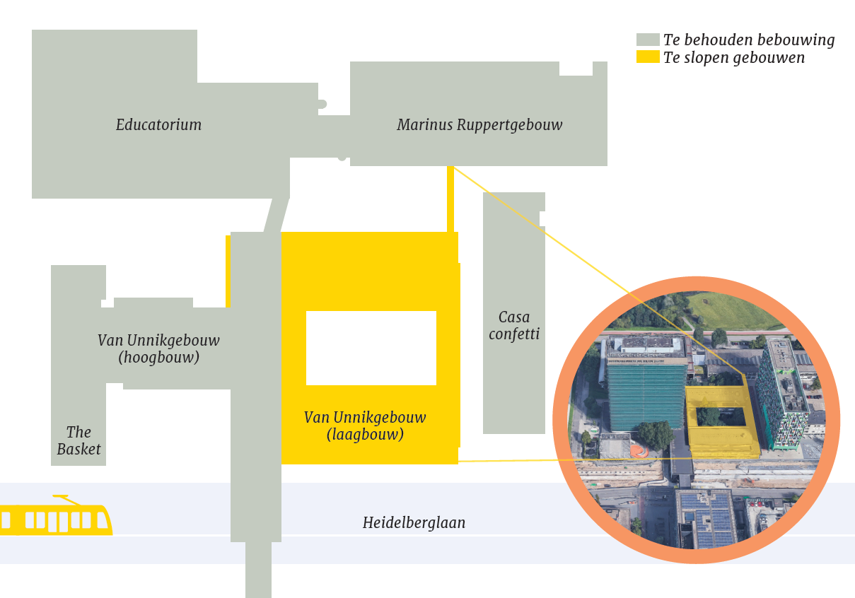 Materialen die niet hergebruikt kunnen worden, zoals vloerbedekking en houtconstructies, worden afgevoerd. Ook het aanwezige asbest wordt met zorg verwijderd. De loopbrug tussen de laagbouw en het Ruppertgebouw verdwijnt tussen 21 en 30 december, waarbij mensen in beschermende witte pakken rondlopen voor het verwijderen van asbest. Het kale betonnen skelet dat overblijft, wordt in het nieuwe jaar afgebroken. In mei 2021 is de demontage en sloop van de laagbouw waarschijnlijk afgerond.