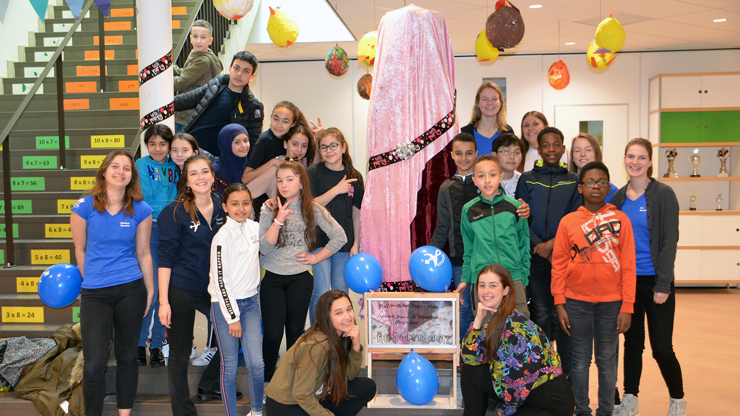 Op het podium staat een langwerpig object ingepakt. Een van de studenten heet de aanwezigen welkom en geeft het woord aan drie leerlingen uit groep acht. “Wij hebben samen met kunstenaar Jasper en de studenten van project Move een mini-domtoren gemaakt en hij is wel twee meter hoog”, vertelt Nora Mohdadi (12). Dan wordt er enthousiast afgeteld van twintig naar nul. Er klinkt applaus en daar staat de mini-domtoren in volle glorie.