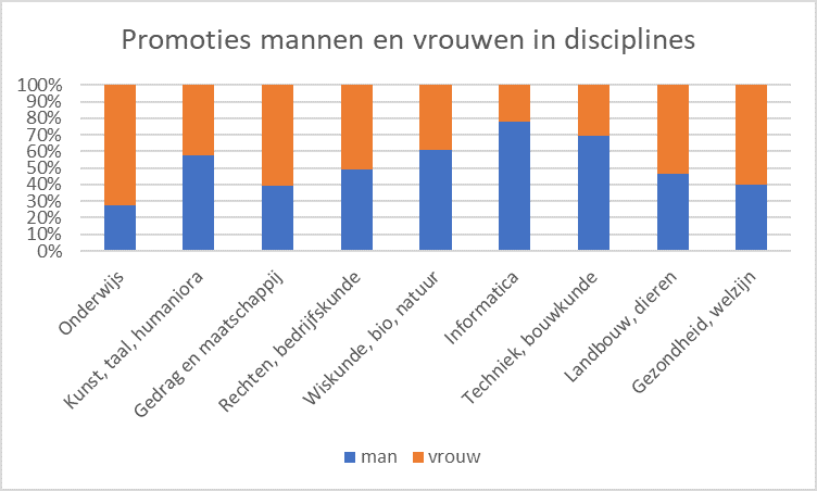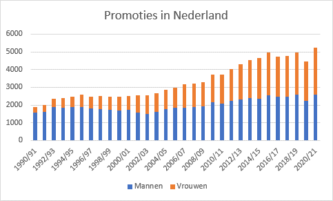 Een jaar eerder hielden mannen nog net de overhand, met een voorsprong van 24 promoties. In alle jaren ervoor was het verschil stukken groter.