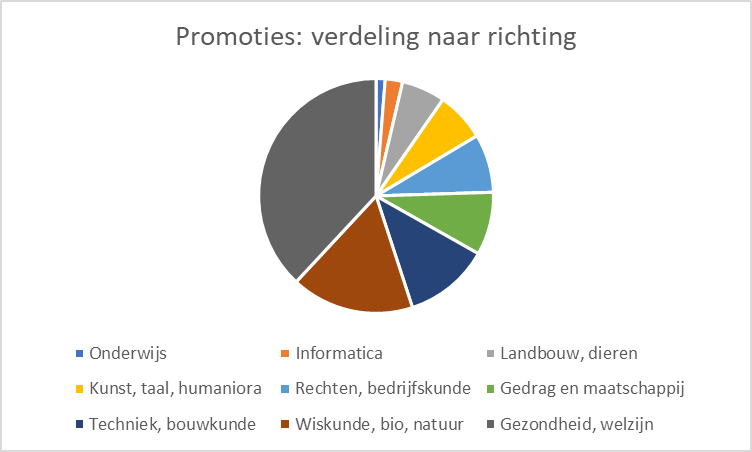 Sinds het jaar 2000 is het jaarlijkse aantal toegekende doctorstitels meer dan verdubbeld. Bijna 40 procent van alle promoties komt voor rekening van het domein gezondheid en welzijn, dat naar verhouding veel vrouwen trekt.
