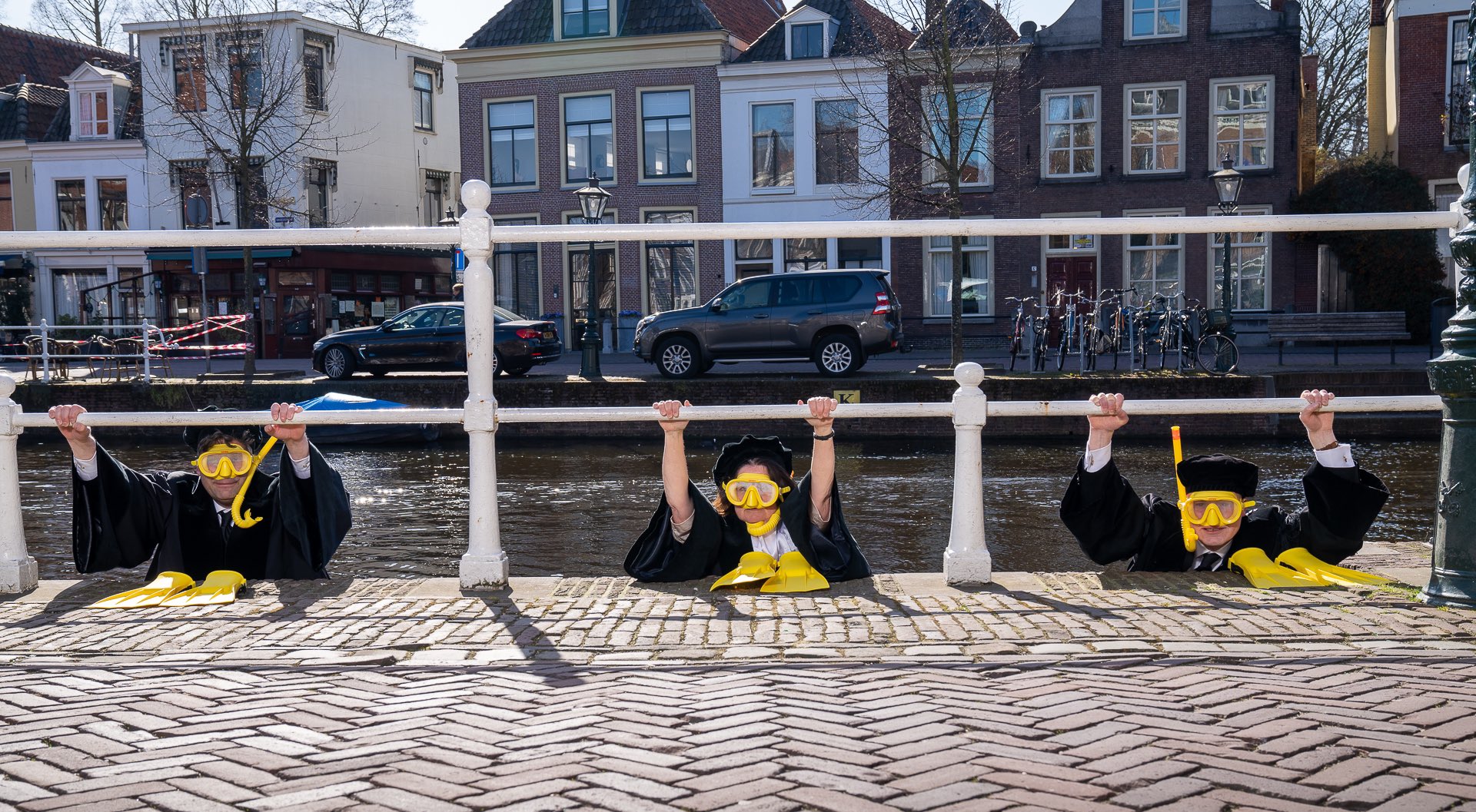 Een Leidse hoogleraar gaat nog een stapje verder en heeft zichzelf maar alvast in een gracht gefotoshopt. Een Utrechtse promovendus steekt haar hoofd in een emmer met goudvissen erop. Zonder extra geld gaat de Nederlandse wetenschap naar de haaien, waarschuwt ze.