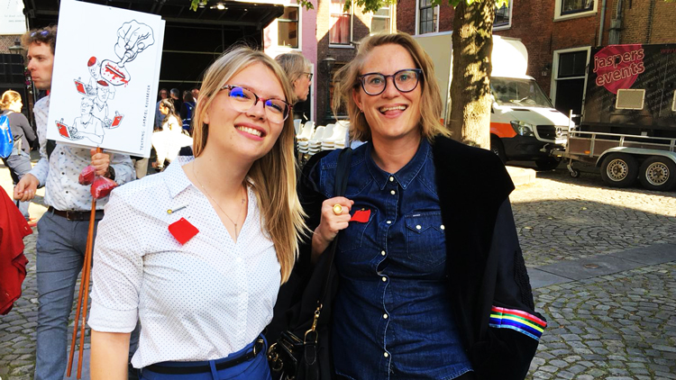 UUinActie-raadsleden in Leiden. Links student Ashley van Driel, rechts hoogleraar Annelien de Dijn, foto: Floris Boudens
