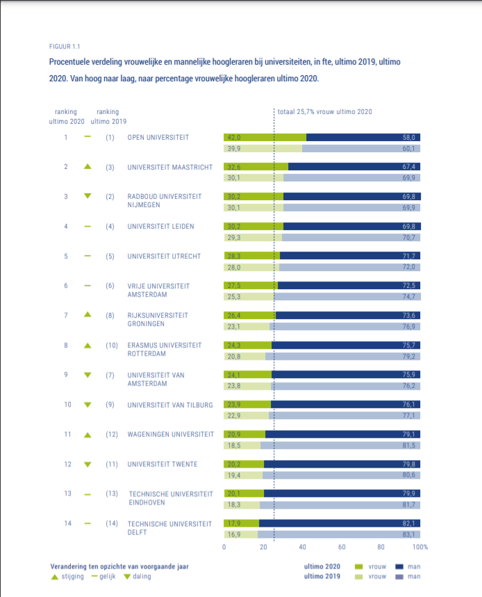 Bron: Monitor Vrouwelijke Hoogleraren, LNVH. Percentage vrouwelijke hoogleraren in 2019 en 2020.